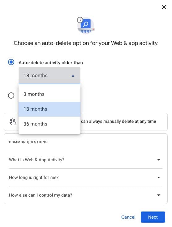 Step 2: Under Web & App Activity, click on the Auto-delete option. From the window that pops up, you’ll be able to decide the timeframe after which all your Google account activity will be deleted.